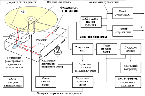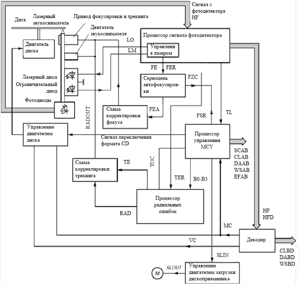 Система управления лазерным диодом обеспечивает номинальный ток возбуждения диода в режимах пуска диска и считывания информации. Признаком нормальной работы системы является наличие ВЧ-сигнала амплитудой около 1 В на выходе системы считывания.