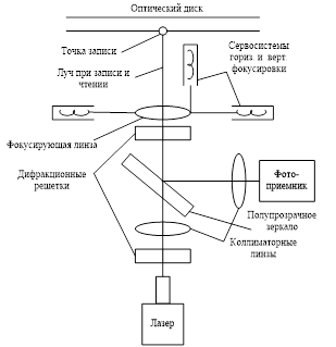 Конструкция оптической головки, предназначенной для записи и считывания дисков, приведена на рисунке 1.23. Наиболее распространены компакт-диски диаметром 119 мм (4,7 дюймов). На однократно записываемом диске такого диаметра располагается 550 либо 680 Мбайт. Производятся так же диски диаметром 80 мм емкостью 200 Мбайт