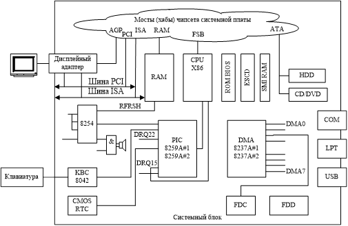 Структурная схема современного IBM PC-совместимого компьютера приведена на рисунке 3.13. Ядром компьютера является процессор (CPU), один или несколько, ОЗУ (RAM), ПЗУ с BIOS (ROM BIOS) и интерфейсные средства, связывающие их между собой и с остальными компонентами. На рисунке изображены лишь логические связи между этими устройствами.
