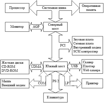 Для согласования быстродействия на системной плате устанавливаются специальные микросхемы (чипсеты), включающие в себя контроллер оперативной памяти (северный мост) и контроллер периферийных устройств (южный мост) (рисунок 3.14).