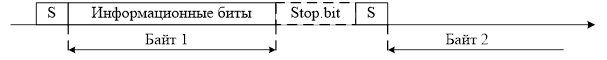 Стартовый сигнал изменяет состояние линии интерфейса и служит для запуска генератора приемнике, стоповой сигнал переводит линию в исходное состояние и останавливает работу генератора. Таким образом, синхронизация передатчика и приемника поддерживается только в интервале одного байта.