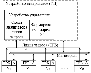Если обмен в интерфейсе производится по инициативе подчиненного устройства Уi, то вначале исключается возможность использования магистрали любым другим устройством. С этой целью в магистрали предусматривают специальную линию запросов (линия ТРБ), на которую любое устройство Уi независимо от других может выставлять сигнал запроса (или требования ТРБ). Сигнал запроса означает для Уц, что на магистрали имеется одно или несколько устройств Уi, запрашиваемых обмен. Обнаружив сигнал запроса (эту функцию выполняет схема анализа ТРБ), устройство Уц должно дать разрешение на занятие магистрали только одному из запрашивающих устройств Уi для выполнения передачи данных. Для этого проводится опрос устройств Уi, т.е. устройство Уц последовательно осуществляет адресацию всех Уi до тех пор, пока не получит подтверждения запроса. Подтверждение запроса может быть передано любым способом, например по информационной шине, так как в процессе опроса при последовательном переборе адресов каждое из устройств Уi получает разрешение на занятие магистрали. Так, при совпадении собственного и запрашиваемого адресов устройство Уi может выставить на информационную шину свой адрес, подтвердив совпадение, или какой либо код, означающий несовпадение; кроме того, может быть выделена специальная линия для передачи сигналов подтверждения. Устройство Уц, получив подтверждение от Уi, прекращает дальнейшее формирование адресов, т.е. приостанавливает опрос, а устройство Уi, которое в процессе опроса опознало свой адрес и подтвердило совпадение адресов, логически подключается к магистрали для передачи данных.