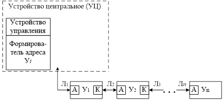 Если обмен инициируется устройством Уц, адрес запрашиваемого устройства (Уi) передается на линии Л1 и попадает в устройство У1. Запрашиваемый адрес в устройстве У1 сравнивается с собственным адресом У1. Если адреса не совпали, то коммутатор К соединяет линии Л1 с линиями Л2. Таким образом адрес запрашиваемого устройства попадает в У2 и процедура повторяется. Если значения адресов совпали, то коммутатор К остается в разомкнутом состоянии, а устройство, опознавшее свой адрес, логически подключается к Уц. При цепочной схеме подключения устройств процедура адресации выполняется последовательно.