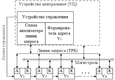 Если инициируется обмен со стороны устройств У1,...,Уn, то каждое из них может выставлять сигнал запроса на линию ТРБ. Получив этот сигнал, устройство Уц с целью селекции запрашивающего устройства начинает процедуру опроса, т.е.выдает сигнал на линию ТРБ. Сигнал ТРБ поступает на устройства У1. В случае, если обмен инициирован устройством У1, т.е. сигнал ТРБ сформирован в У1, линии магистрали посредством коммутатора К подключается к У1, устройство формирует сигнал ЗАН, а сигнал ТРБ на следующее устройство У2 не передает. Если сигнал ТРБ был сформирован каким-либо другим устройством, то устройство У1 передает сигнал ТРБ по цепочной линии на устройство У2, где производится такой же анализ. Таким образом, последовательный анализ наличия запроса на обмен в каждом из устройств У1,...,Уn позволяет выделить одно из них, обладающее наибольшим приоритетом среди всех устройств, инициирующих обмен. Для своей идентификации устройство Уi в начале сообщения передает свой адрес.