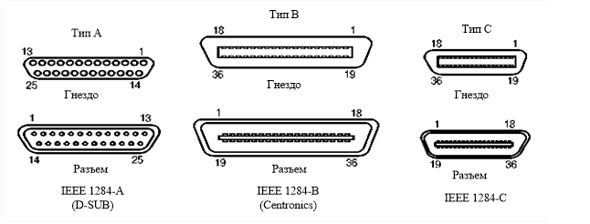Стандарт IEEE 1284 определяет три типа используемых разъемов: А (DB-25), B (Centronics-36), C (новый малогабаритный 36-контактный разъем).