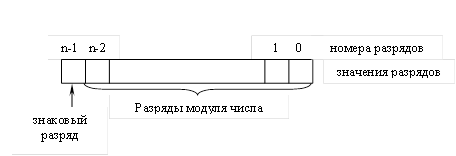 При решении задач целые числа встречаются в случаях представления индексов переменных, подсчета числа повторений каких-либо действий и т.д. Для хранения целых чисел в ячейке памяти предусматривается распределение разрядов (разрядная сетка) (рис. 1). Один из n разрядов отводится под знак числа, остальные разряды отводятся под модуль числа.