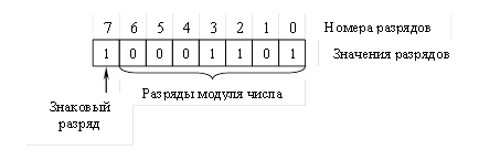 Обычно применяют следующий способ кодирования знака числа: «+» обозначают цифрой 0, а «–» – цифрой 1 в знаковом разряде.
