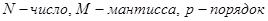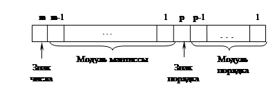 Число состоит из мантиссы, старший разряд которой определяет знак числа, и порядка со знаком. Значение модуля мантиссы представляется двоичным дробным числом, т.е. запятая фиксируется перед старшим разрядом модуля мантиссы, порядок представляется целым числом. Порядок указывает действительное положение запятой в числе. В общем виде число с плавающей точкой записывается следующим образом: