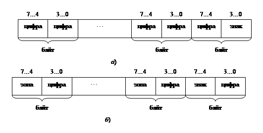 При использовании упакованного формата каждый байт (8 разрядов двоичного числа) содержит две десятичные цифры (рис 5,а).