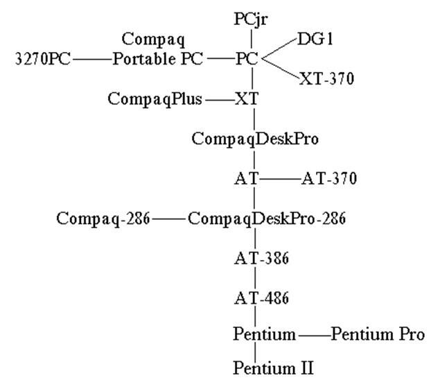 Центральная линия обозначает главную ветвь семейства, на которой модели располагаются в соответствии с их мощностями: от наименее мощной PCjr до наиболее мощной AT/486. Ветви в стороны ‑ это модели со сходными характеристиками.