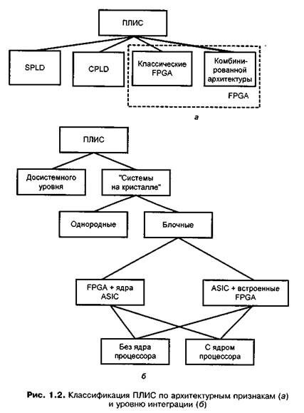 Классификация по уровню интеграции (рис. 1.2, б) дана кратко и отражает, главным образом, ситуацию последних годов — бурный рост уровня интеграции ПЛИС и выделение из них класса "системы на кристалле". В силу связи между уровнем интеграции и архитектурой, классификация не является строгой, и в ней имеется некоторое смешение двух признаков, однако она принята в показанном виде ради соответствия практически сложившимся понятиям.