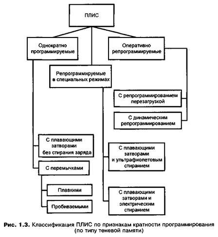 Классификация по признаку кратности программирования, определяемой типом памяти конфигурации (называемой также теневой памятью), приведена на рис. 1.3.