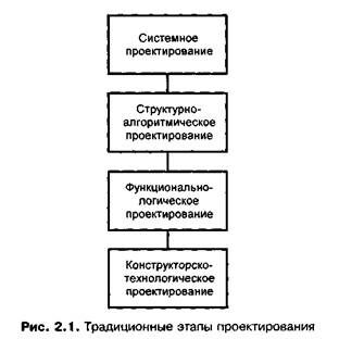 Различие теоретической базы и понятийного аппарата, используемых на разных стадиях проектирования, приводит к тому, что традиционным является разбиение процесса проектирования как электронных систем, так и БИС/СБИС, на этапы, приведенные на рис. 2.1.
