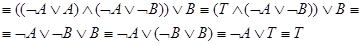 Попробуем установить является ли эта же формула тавтологией синтаксическим методом. Для этого раскроем все скобки и убедимся, что результат упрощается до формул с очевидными значениями истинности: