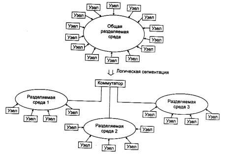 Под логической структуризацией сети понимается разбиение общей разделяемой среды на логические сегменты, которые представляют самостоятельные разделяемые среды с меньшим количеством узлов. Сеть, разделенная на логические сегменты, обладает более высокой производительностью и надежностью. Взаимодействие между логическими сегментами организуется с помощью мостов и коммутаторов.