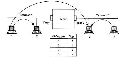 Мост соединяет два логических сегмента. Сегмент 1 составляют компьютеры, подключенные с помощью одного отрезка коаксиального кабеля к порту 1 моста, а сегмент 2 - компьютеры, подключенные с помощью другого отрезка коаксиального кабеля к порту 2 моста.