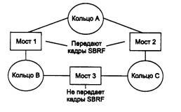 При получении каждого пакета SR-мосту нужно только просмотреть поле маршрутной информации (поле Routing Information Field, RIF, в кадре Token Ring или FDDI) на предмет наличия в нем своего идентификатора. И если он там присутствует и сопровождается идентификатором кольца, которое подключено к данному мосту, то в этом случае мост копирует поступивший кадр в указанное кольцо. В противном случае кадр в другое кольцо не копируется. В любом случае исходная копия кадра возвращается по исходному кольцу станции-отправителю, и если он был передан в другое кольцо, то бит А (адрес распознан) и бит С (кадр скопирован) поля статуса кадра устанавливаются в 1, чтобы сообщить станции-отправителю, что кадр был получен станцией назначения (в данном случае передан мостом в другое кольцо).