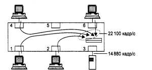 Причина перегрузок обычно кроется не в том, что коммутатор является блокирующим, то есть ему не хватает производительности процессоров для обслуживания потоков кадров, а в ограниченной пропускной способности отдельного порта, которая определяется временными параметрами протокола. Например, порт Ethernet не может передавать больше 14 880 кадров в секунду, если он не нарушает временных соотношений, установленных стандартом.