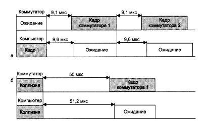 Во втором случае кадры коммутатора и компьютера столкнулись и была зафиксирована коллизия. Так как компьютер сделал паузу после коллизии в 51,2 мкс, как это положено по стандарту (интервал отсрочки равен 512 битовых интервалов), а коммутатор - 50 мкс, то и в этом случае компьютеру не удалось передать свой кадр.