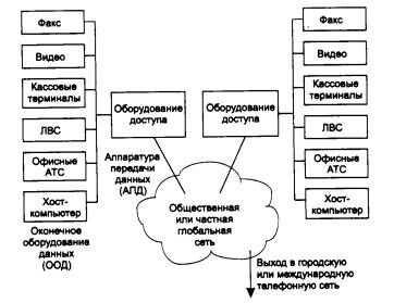 передачу пакетов локальных сетей, передачу пакетов мини-компьютеров и мейнфреймов, обмен факсами, передачу трафика офисных АТС, выход в городские, междугородные и международные телефонные сети, обмен видеоизображениями для организации видеоконференций, передачу трафика кассовых аппаратов, банкоматов и т. д. и т. п. Основные типы потенциальных потребителей услуг глобальной компьютерной сети изображены на рис. 6.1.