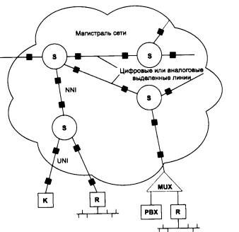 Типичный пример структуры глобальной компьютерной сети приведен на рис. 6.2. Здесь используются следующие обозначения: S (switch) - коммутаторы, К - компьютеры, R (router) - маршрутизаторы, MUX (multiplexor)- мультиплексор, UNI (User-Network Interface) - интерфейс пользователь - сеть и NNI (Network-Network Interface) - интерфейс сеть - сеть. Кроме того, офисная АТС обозначена аббревиатурой РВХ, а маленькими черными квадратиками - устройства DCE,о которых будет рассказано ниже.