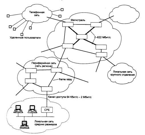 Показанная на рис. 6.5. структура глобальной сети, используемой для объединения в корпоративную сеть отдельных локальных сетей и удаленных пользователей, достаточно типична. Она имеет ярко выраженную иерархию территориальных транспортных средств, включающую высокоскоростную магистраль (например, каналы SDH 155-622 Мбит/с), более медленные территориальные сети доступа для подключения локальных сетей средних размеров (например, frame relay) и телефонную сеть общего назначения для удаленного доступа сотрудников.