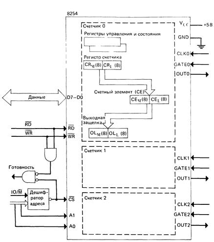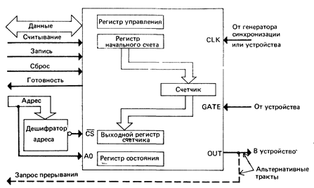 Устройство вводит значение в регистр начального счета, передает его в счетчик и выполняет счет "назад" (т. е. вычитание) импульсами со входа CLK. Текущее содержимое счетчика в любой момент можно ввести в процессор, не нарушая работы счетчика, посредством передачи его в выходной регистр счетчика с последующим считыванием из этого регистра. При буферировании содержимого счетчика не требуется вводить его в процессор немедленно. Индикация нуля в счетчике обычно фиксируется на выходе OUT и в одном бите регистра состояния. Поэтому для обнаружения нуля допускается применять Программный ввод-вывод и ввод-вывод по прерываниям.