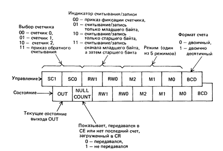 Регистр управления определяет режим работы и выполняет другие функции. Режим точно определяет, что происходит при достижении счетчиком 0 и (или) при подаче сигнала на вход GATE. Возможными действиями являются: