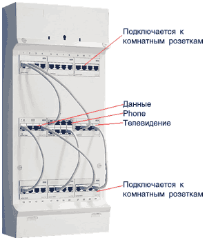Входными коммуникациями для распределительного центра являются кабели от поставщика услуг телефонной связи, интернета, телевизионная антенна и т.п. Используя патч-кабель, любую розетку можно подключить к любому источнику сигнала.