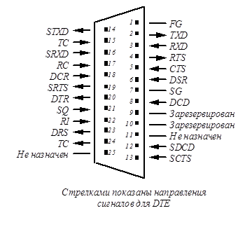 Рис. 1. Назначение линий 25–контактного разъема типа D для интерфейса RS–232C
