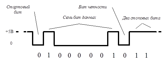 Наиболее широко распространен формат, включающий в себя один стартовый бит, один бит паритета и два стоповых бита. Начало пакета данных всегда отмечает низкий уровень стартового бита. После него следует 7 бит данных символа кода ASCII. Бит четности содержит 1 или 0 так, чтобы общее число единиц в 8–битной группе было нечетным. Последним передаются два стоповых бита, представленных высоким уровнем напряжения. Эквивалентный ТТЛ–сигнал при передаче буквы А показан на рис. 2.