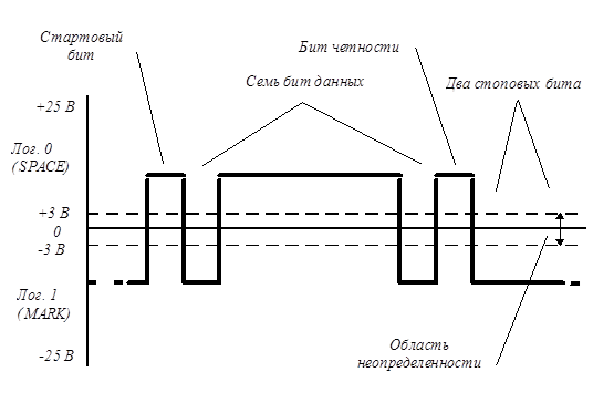 Используемые в интерфейсе RS–232C уровни сигналов отличаются от уровней сигналов, действующих в компьютере. Логический 0 (SPACE) представляется положительным напряжением в диапазоне от +3 до +25 В, логическая 1 (MARK) — отрицательным напряжением в диапазоне от –3 до –25 В. На рис. 3 показан сигнал в том виде, в каком он существует на линиях TXD и RXD интерфейса RS–232C.