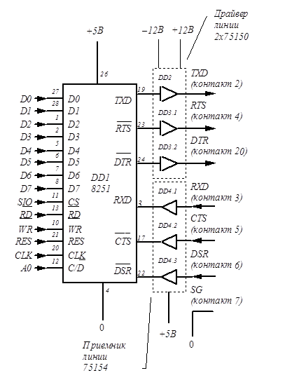 Сдвиг уровня, т.е. преобразование ТТЛ–уровней в уровни интерфейса RS–232C и наоборот производится специальными микросхемами драйвера линии и приемника линии.