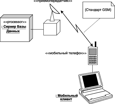 | Диаграмма развёртывания На диаграмме развертывания, или применения (Deployment diagram), показана конфигурация обрабатывающих узлов, на которых выполняется система, и компонентов, размещенных в этих узлах. Диаграмма развертывания представлена в виде графа с ребрами и вершинами. | ||