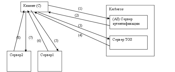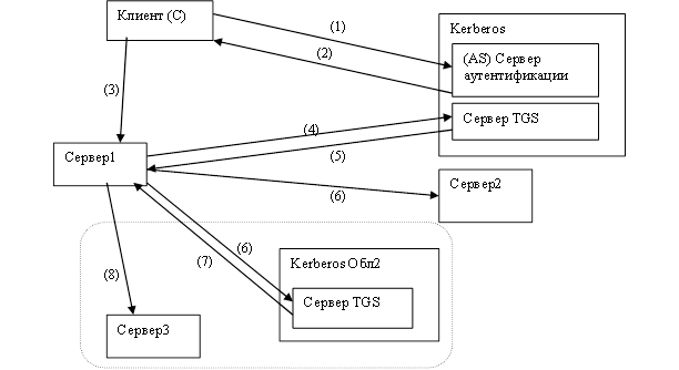 (4) Сервер 1 использует полученный (переданный) мандат для обращения к TGS, чтобы получить сеансовый мандат, нужный для соединения с другим сервером. При этом запрос сеансового мандата производится от лица клиента.