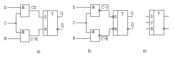 На рис. 3,в показано условное изображение синхронных RS-триггеров в схемах.