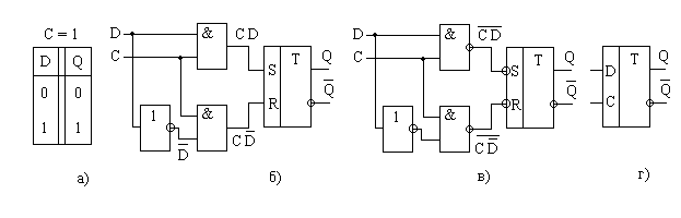 Таблица 1,в является таблицей переходов D-триггера. Триггер устанавливается в состояние, соответствующее уровню сигнала на входе 0.
