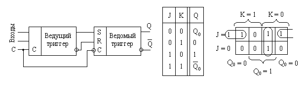 На рис. 6 таблица состояний JK-триггера представлена в форме диаграммы Вейча, из которой можно получить следующее логическое выражение, определяющее функционирование JK-триггера: