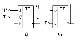 Режим Т-триггера может быть получен с помощью JK-триггера либо D-триггера, как показано на рис. 4.10,а,б.