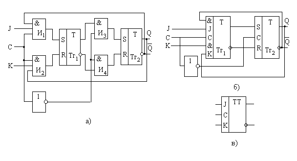 одном и том же состоянии. При переходе на входе С к уровню лог. 1 на синхронизирующий вход триггера Тг2 через инвертор подается уровень лог. 0 и логическая связь между триггерами обрывается. Триггер Тг1 устанавливается в состояние Q, определяемое выражением (4.5). Подача вновь на вход С уровня лог. 0 приводит к передаче состояния Q из триггера Тг1, в триггер Тг2. Символическое изображение описанного JK-триггера приведено на рис. 4.7,в.