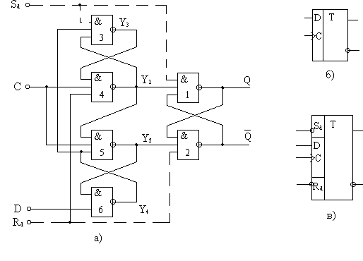 На рис. 3,а,б показаны логические структуры синхронного RS-триггера. Как видно из представленных структур, синхронный RS-триггер состоит из асинхронного триггера с прямыми (либо инверсными) входами, на входах R и S которого включены логические элементы И (И-НЕ). С помощью логических элементов И (H-HE) обеспечивается передача активных уровней информационных входов S и R синхронного триггера на входы S и R входящего в его состав асинхронного триггера только при наличии уровня лог. 1 на синхронизирующем входе С.