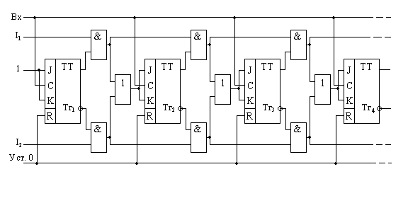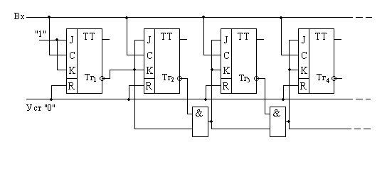 Рассмотренная схема счетчика имеет следующие недостатки. Пусть первые k триггеров младших разрядов счетчика установлены в состояние лог. 1 и на вход счетчика поступает очередной импульс. При этом будет происходить процесс последовательного переключения триггеров. Если x - время переключения триггера, то относительно отрицательного фронта входного импульса первый триггер переключится с задержкой x, второй триггер переключается с задержкой x относительно отрицательного фронта сигнала на выходе первого триггера и с задержкой 2x относительно отрицательного фронта входного импульса и т. д. Следовательно, задержка в переключении k-го триггера составит kx. При большом числе разрядов задержка в переключении триггера старшего разряда может оказаться недопустимо большой. Ниже рассматриваются способы уменьшения этой задержки и, таким образом, увеличения быстродействия счетчика.