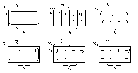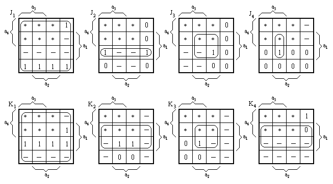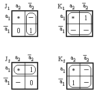Следовательно, в триггере Тг1 происходит переход вида 0 - 1, обеспечиваемый при следующих уровнях на информационных входах: Jl = l; K1 = -; в триггере Тг2 переход вида 0 - 0 обеспечивается уровнями J2 = 0, K2 = -. Эти значения занесены в клетки карт Вейча, соответствующие a2 = 0 и al = 0,