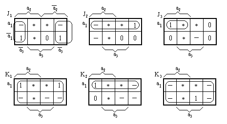 Перевод триггеров из состояния a2 = 0; al = l в следующее состояние a2 = l, al = 0 требует подачи на информационные входы триггеров уровней Jl = -; Kl = l; J2 = l; К2 = -. Эти значения нанесены на карты Вейча для состояния a2 = 0, al = l. Наконец, перевод триггеров из состояния a2 = 1, al = 0 в состояние a2 = 0, a1 = 0 требует следующих уровней на входах: J1 = 0; Kl = -; J2 = -; K2 = l.