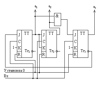 Делитель частоты с коэффициентом деления N = 3. Счетчик с периодом цикла N = 3 имеет простейшие межтриггерные связи без использования логических элементов. Этот счетчик может одновременно служить и делителем частоты с коэффициентом N = 2.