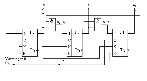Кольцевой счетчик обеспечивает высокую скорость работы. Это связано с тем, что единица из одного триггера в другой передается непосредственно (без использования в цепи передачи логических элементов) путем подключения входов J и К каждого триггера соответственно к прямому и инверсному выходам предыдущего триггера.