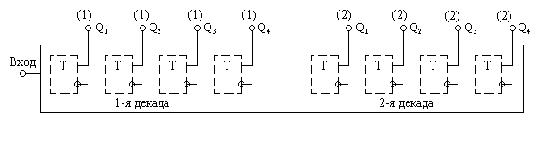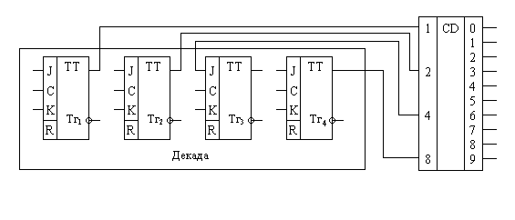 В рассмотренных выше счетчиках число поступлений на вход импульсов представляется в форме двоичного числа, цифры разрядов которого выражаются через состояние триггеров. При этом, если требуется получить десятичное представление числа импульсов, к выходам счетчика подключается дешифратор.