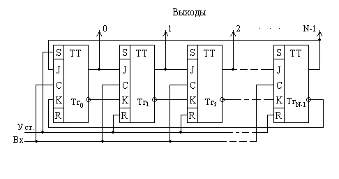 В счетчике использовано N триггеров. Перед началом счета импульсом начальной установки триггер Тг0 устанавливается в состояние 1, остальные триггеры - в состояние 0. Этому состоянию счетчика соответствует число О; на выход счетчика, обозначенный цифровой 0, с прямого выхода триггера Тг0 передается лог. 1. Далее каждый из приходящих на вход счетчика импульсов переписывает 1 в следующий триггер и лог. 1 передается на следующий выход, обозначенный цифрой, на единицу большей. Таким образом, по тому, какой из триггеров находится в состоянии 1, т. е. на выходе какого из триггеров возникает уровень лог. 1, выявляется число поступивших на