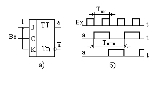 Делитель частоты с коэффициентом деления N = 2. Схема делителя приведена на рис. 8.54,а. В моменты отрицательного фронта входных импульсов триггер переключается в новое состояние. Как видно из временной диаграммы на рис. 8.54,а, период импульсной последовательности Твых на выходе триггера оказывается вдвое больше периода Твх следования импульсов на входе. Следовательно, fвых = 1/Tвых = 1/(2Tвх) = fвx/2, т. е. частота следования импульсов на выходе в 2 раза ниже, чем на входе.
