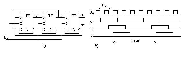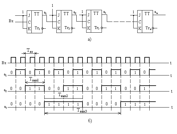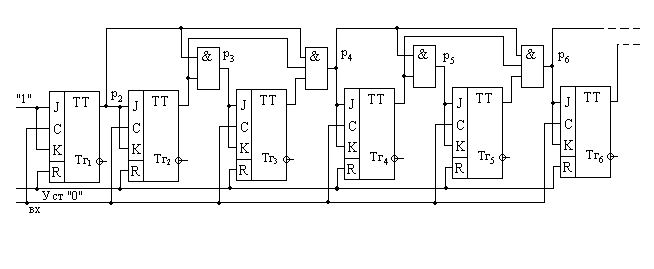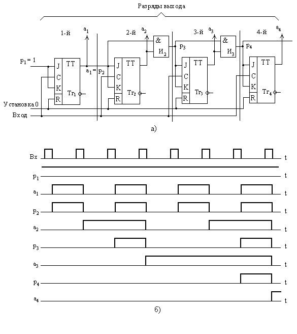 - сигнал с прямого выхода триггера каждого разряда поступает на счетный вход С триггера следующего более старшего разряда, а на счетный вход триггера 1-го разряда Тг1 подаются входные просчитываемые импульсы.
